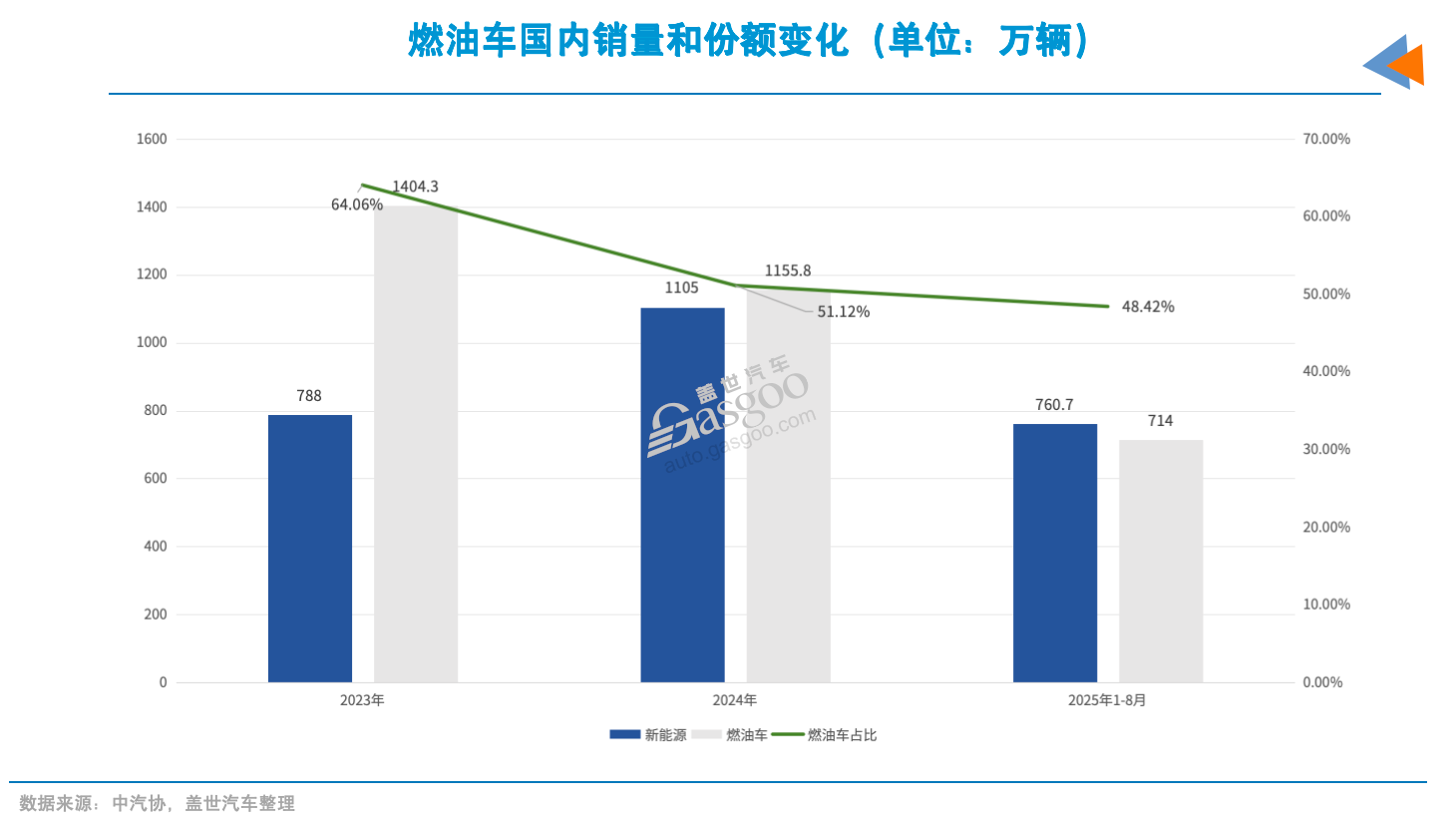 燃油车则在同一时期连续下滑,在国内市场2024年销量降至1155万辆,同比下降17.3%,市场份额跌至51%。关于燃油车“日薄西山”的观点不时被提出。