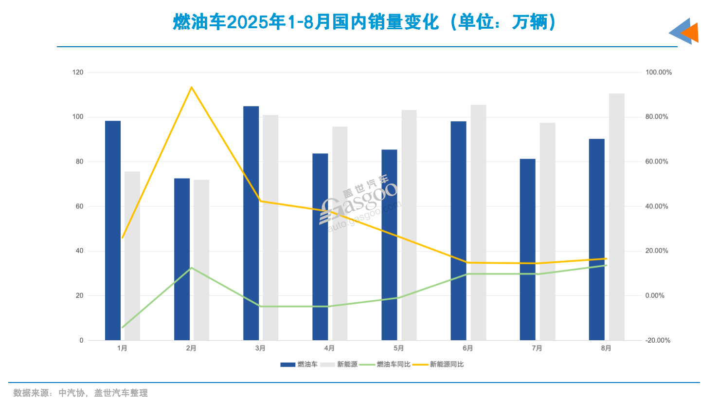 中汽协数据显示,8月传统燃油车国内销量为90.2万辆,同比增长13.5%。这已是燃油车市场销量连续三个月保持增长。